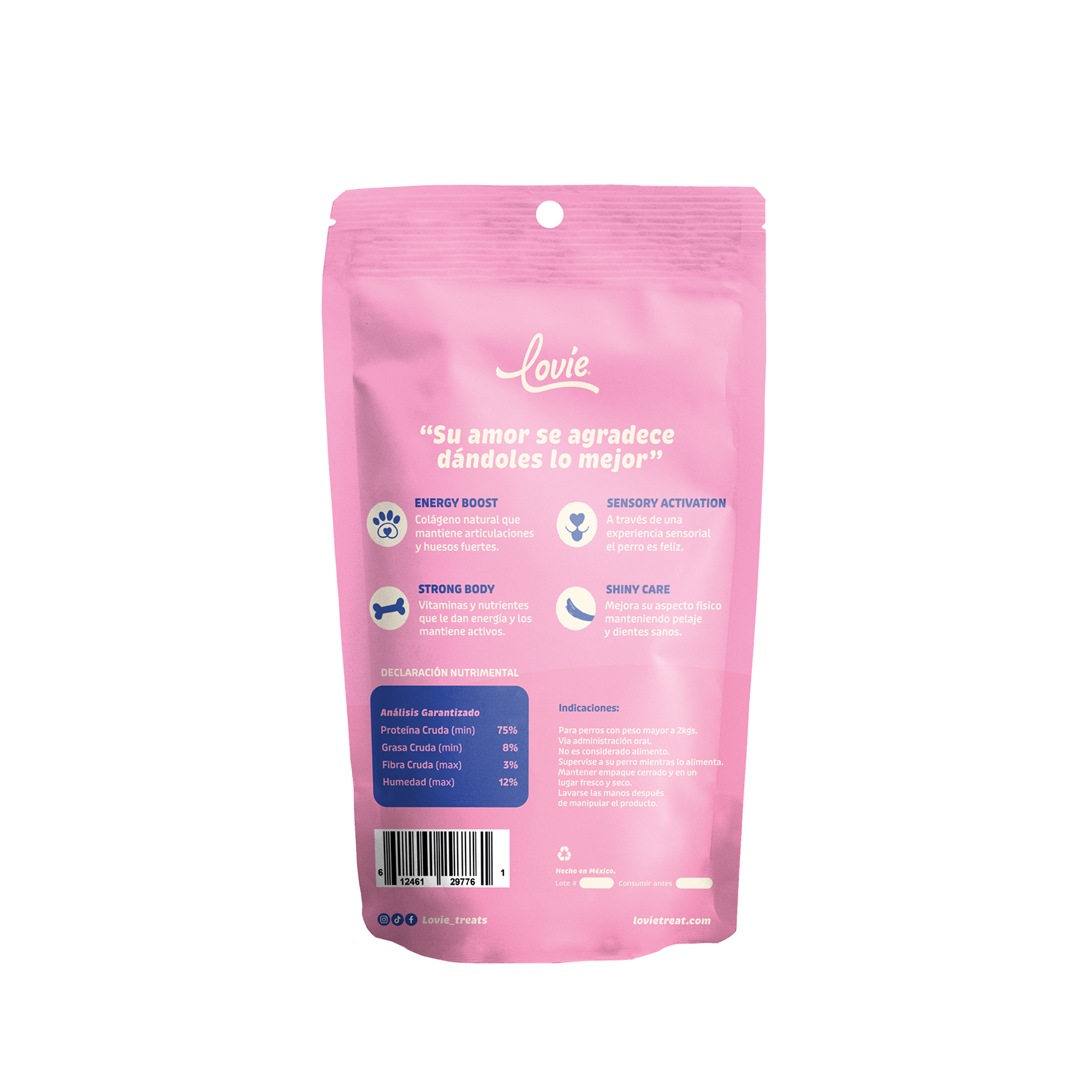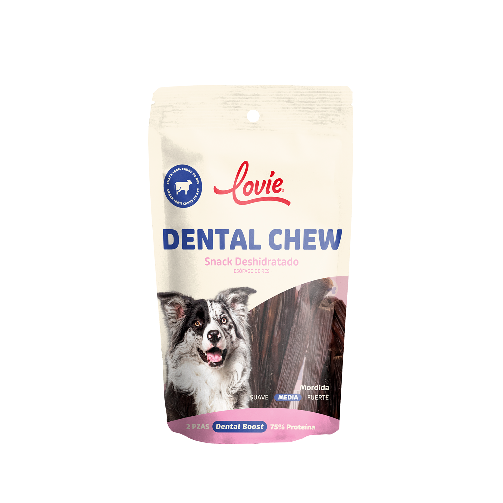 Lovie Treats Dental Chews, made with dehydrated beef esophagus, are the ideal snack to maintain your dog's oral health. Its firm, chewy texture helps remove tartar, reduce plaque and prevent bad breath, while its high protein content contributes to stronger jaws. Plus, it's a 100% natural, safe and delicious snack for dogs of all breeds and sizes.